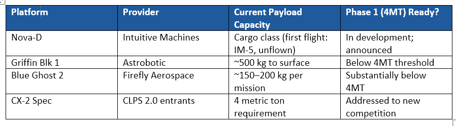 The gap between current platform capacity and the Phase 1 4MT specification is not a flaw in NASA’s planning. It is the program structure. Phase 1 is explicitly framed as ‘Build, Test, Learn,’ with the 30-landing cadence serving as the operational baseline for technology maturation before crewed surface operations. What it does mean for investors is that the ‘30 landings at Phase 1 scale’ headline blends two distinct periods: a near-term period using current platforms in the sub-500 kg range, and a medium-term period requiring new or significantly upgraded landers procured under CLPS 2.0. Treating 30 as a uniform demand signal across that entire arc overstates near-term revenue capacity per mission.