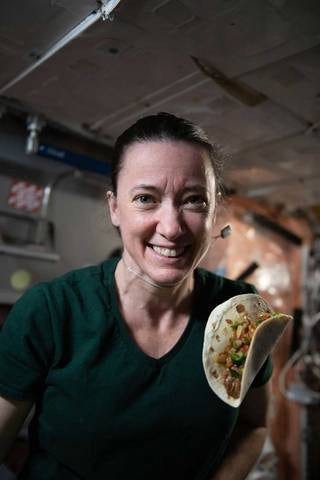 (Source: NASA news release. Images provided and from file. Pictured: NASA astronaut and Expedition 66 flight engineer Megan McArthur is seen with a taco made using fajita beef, rehydrated tomatoes and artichokes, and chile peppers as part of Plant-Habitat-04 investigation aboard the International Space Station in 2021)