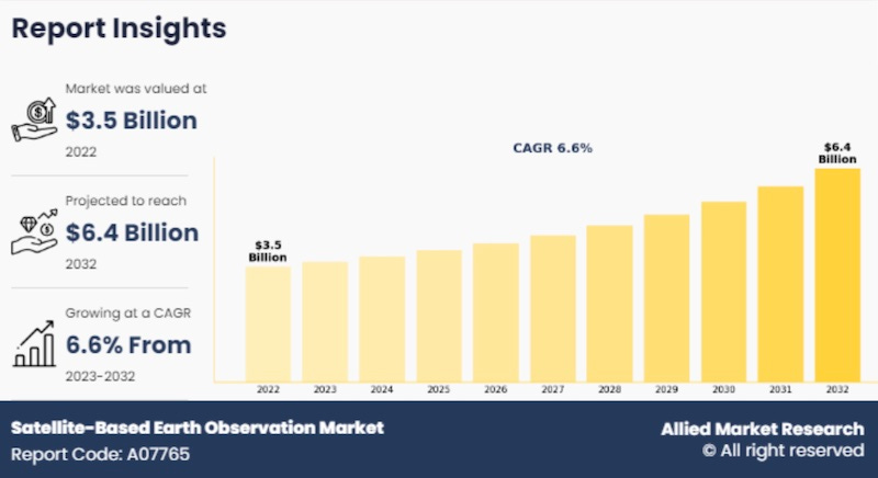 The global satellite-based earth observation market was valued at $3.5 billion in 2022, and is projected to reach $6.4 billion by 2032, growing at a CAGR of 6.6% from 2023 to 2032, according to a new report from Allied Market Research.