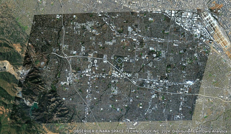 Production of a "first light" image is a critical milestone in the orbital deployment of an imaging satellite. This image represents the satellite's inaugural construction of an image following initial in-orbit testing of the various imaging components. From Nara's raw downlinked data, EDA orthorectifies the imagery, which is to say EDA implements a critical process in the creation of precise satellite imagery, ensuring that each pixel in the image corresponds accurately to its location on the Earth's surface. To orthorectify an image, the EarthPipeline characterizes all of the sensor and satellite properties including the focal length, optical distortion, star tracker mounting alignment and satellite stability. Through a combination of physics-based models and machine learning, EarthPipeline constructs a digital model of the Earth, satellite, and sensor, capturing the precise imaging geometry of each satellite image acquisition. EDA's meticulous approach not only enhances geolocation accuracy, however, but also improves radiometric calibration. EarthPipeline performs advanced radiometric calibration using specific calibration sites to translate pixel values into scientifically accurate signals describing the Earth's ground features. The combination of world-class orthorectification and radiometric calibration lead to Observer-1A's high-quality Analysis Ready Data products.