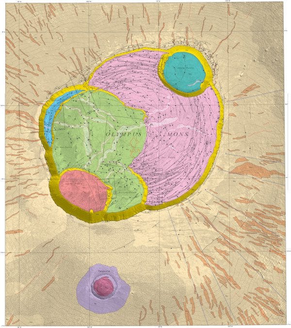 “Probably the most interesting thing about the map is the addition of the contours (Mars maps almost never have this) and these contours have allowed the identification of the late-stage inflation of the summit (in other words, the contours show that some young lava flows appear to flow uphill).”