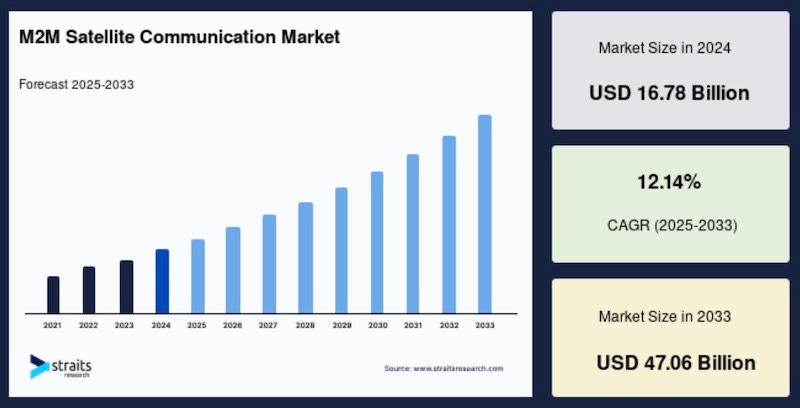 The global M2M (Machine toMachine) satellite communication market size was valued at $16.78 billion in 2024 and is estimated to grow from $18.82 billion in 2025 to reach $47.06 billion by 2033, growing at a CAGR of 12.14% during the forecast period (2025–2033), according to a new report from Straits Research.