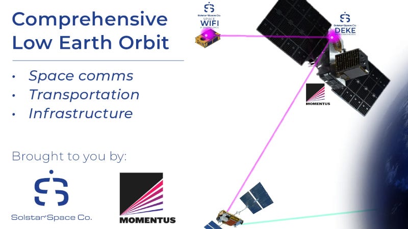 Solstar provides space-based inter-satellite data relay communications, space-to-ground and local area Wi-Fi systems and services to enhance on-orbit operations. The combined offerings include Solstar Deke Narrowband Space Communicators and Slayton Wideband Space Communicators, Solstar Space Walker Wi-Fi and Solstar Space Airtime and Data Services and Momentus logistics, and deployment services and ongoing integration of Solstar communications solutions aboard one or more Momentus Orbital Service Vehicle(s).