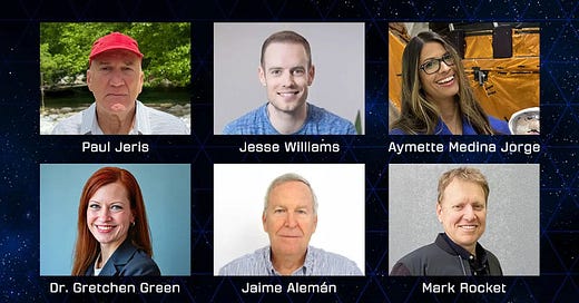 The six people flying on the Blue Origin NS-32 mission have been announced. The crew includes Aymette Medina Jorge, Dr. Gretchen Green, Jaime Alemán, Jesse Williams, Mark Rocket, and Paul Jeris.