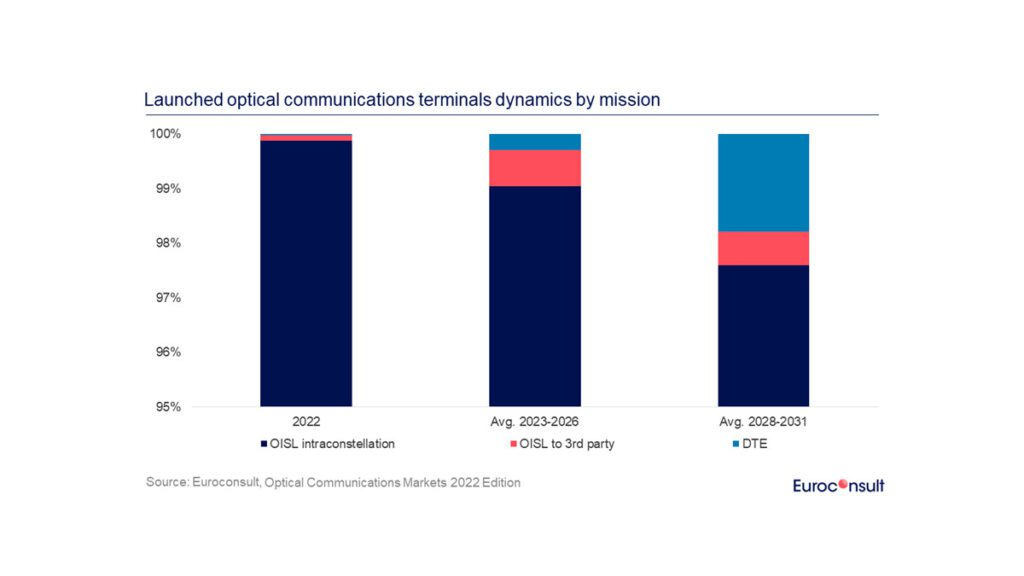Euroconsult found that, over the three categories of applications for optical communications terminals, inter-satellite links (ISL) are largely dominant, driven by increasing adoption among NGSO broadband constellations. Optical inter-satellite links (OISL) terminals are expected to surpass 70,000 units in orbit by 2031.