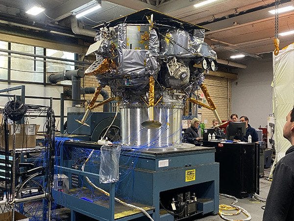 Sine vibration testing replicates the low frequency vibrations the lander will be subjected to through its mounting adapter inside the Vulcan Centaur fairing during liftoff and as Vulcan leaves Earth’s atmosphere. Acoustic testing subjects the lander to the sound pressure waves it will encounter within the fairing during those same phases. These industry-standard tests confirm the lander’s structure and propulsion system along with the lander’s many sensitive avionics, optics, and payloads will survive this intense loading environment as Vulcan delivers it to space.