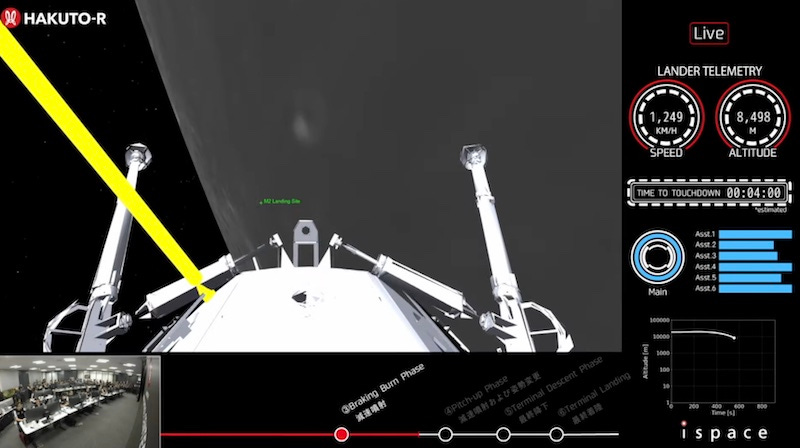 Telemetry was lost from the lander about 65 seconds before the scheduled landing time. After a tense half hour, the ispace commentators on the company live YouTube stream said that the mission control team had been unable to establish communications with the lander.