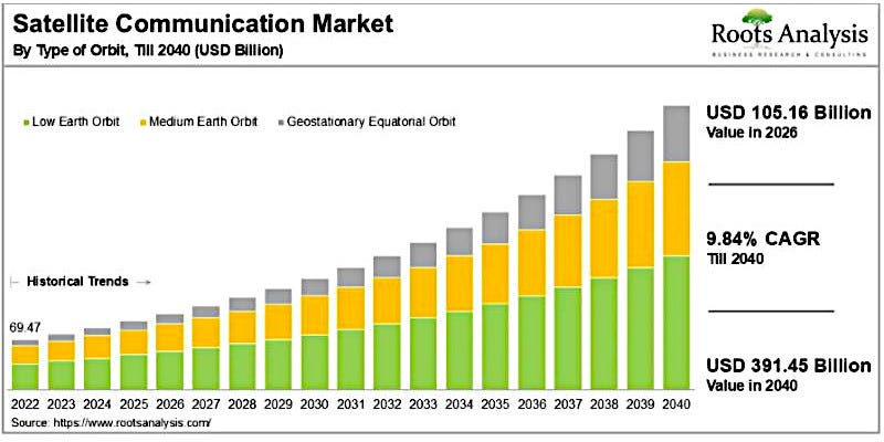 The global satellite communication market, valued at $94.81 billion in 2025, will reach $105.16 billion in 2026 and expand to $391.45 billion by 2040, advancing at a CAGR of 9.84% over the forecast period. According to a new report from Roots Analysis, the growth reflects accelerating demand for broadband connectivity in underserved regions, large-scale low earth orbit constellation deployments, and rising defense investment in secure satellite networks worldwide.