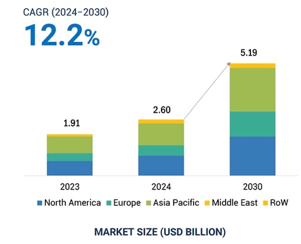 The Satellite Propulsion market, which was estimated in terms of market size to be $2.60 billion in 2024, could reach $5.19 billion by 2030, at a CAGR of 12.2% according to a new report by MarketsandMarkets.