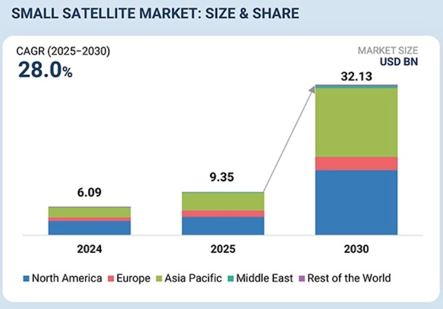 The Small Satellite Market is projected to grow from $9.35 billion in 2025 to $32.13 billion by 2030, with a CAGR of 28.0%, according to a new report from MarketsandMarkets. Increased demand for affordable space missions, more frequent launches, and expanded use in communications, Earth observation, and defense applications are all expected to contribute to the upswing.
