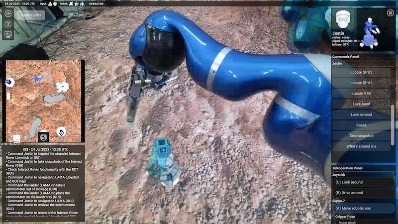 In the test scenario, the first in the ‘Surface Avatar’ series, a stuck pin had to be removed from the lander before the seismometer could be positioned by Justin. Meanwhile the Interact rover had been damaged by a quake during a surface sampling operation, so that the sample still stuck in its gripper needed to be retrieved by Justin and be placed on the lander.