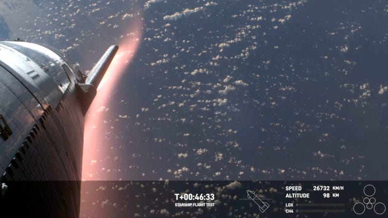 SpaceX was able to maintain telemetry with Starship as it reentered Earth's atmosphere, sending back spectacular video of plasma shedding off the spacecraft as it returned from space. However, the signal from Starship was lost at about T+ 00:49 minutes, and the final minutes of the flight were not recorded. The flight plan called for Starship to hover briefly in landing configuration over the Pacific Ocean before splashing down. It is not yet known if that maneuver was successful